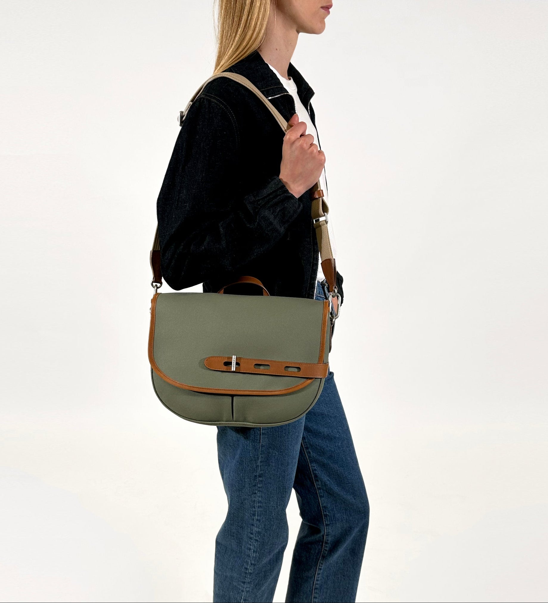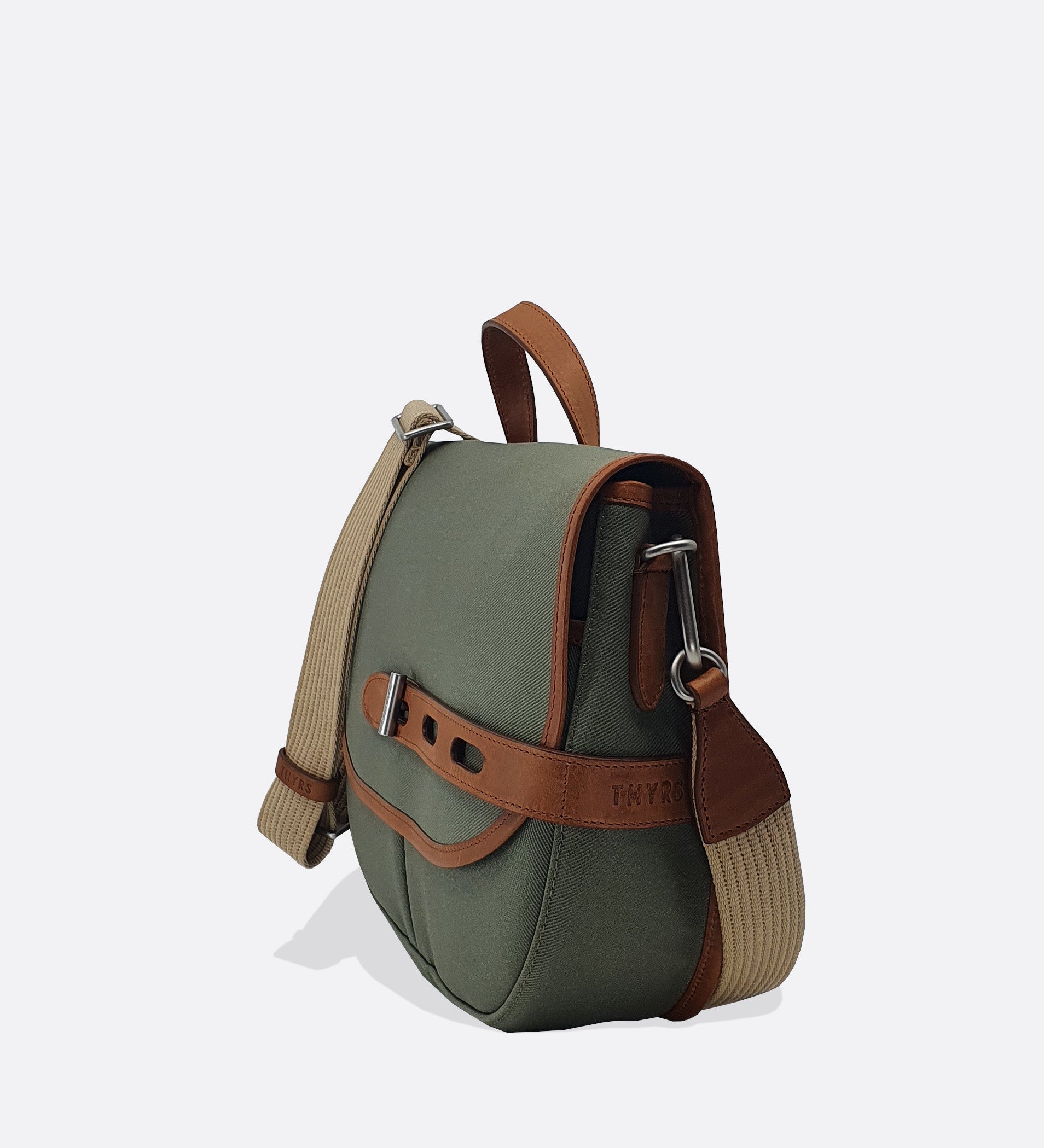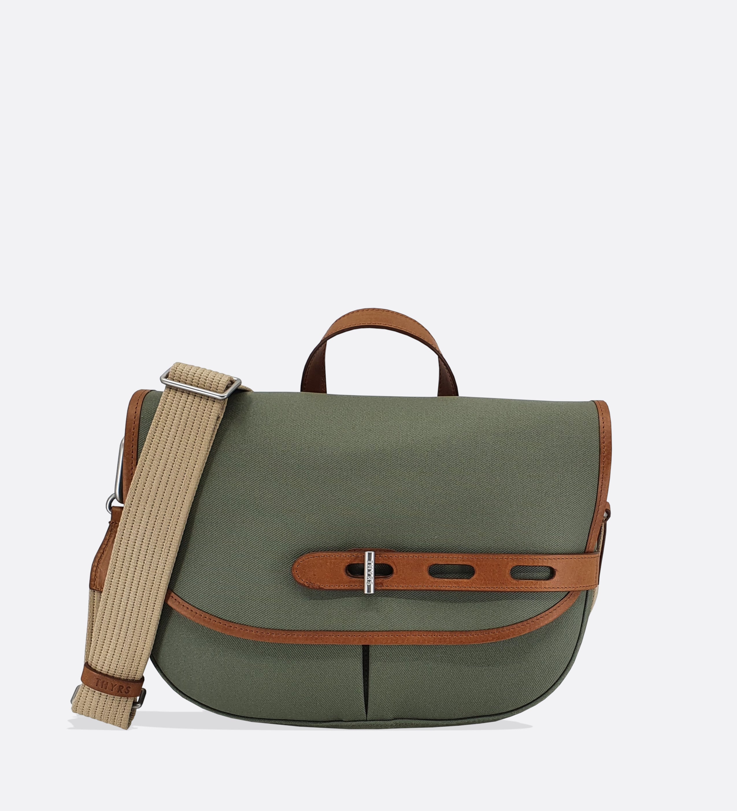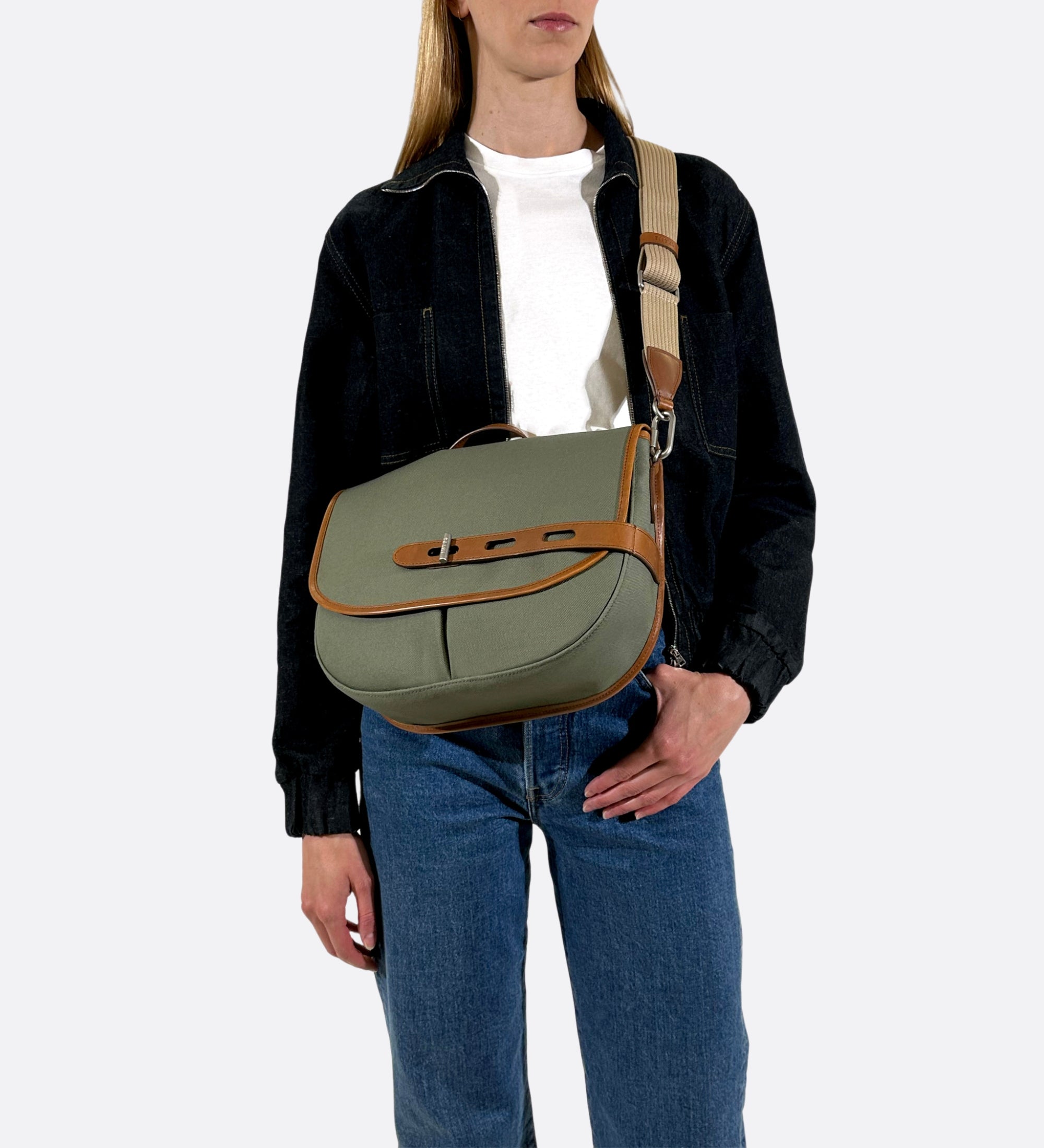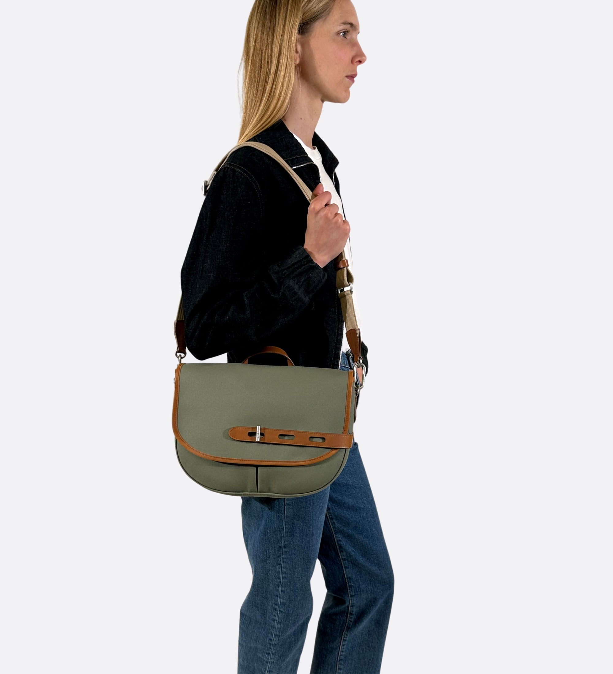 Modèle taille M coloris oxyde kaki. Tissu exclusif Double Twill imperméable et cuir à tannage végétal. Sac fabriqué en France à partir de matières écoresponsables.