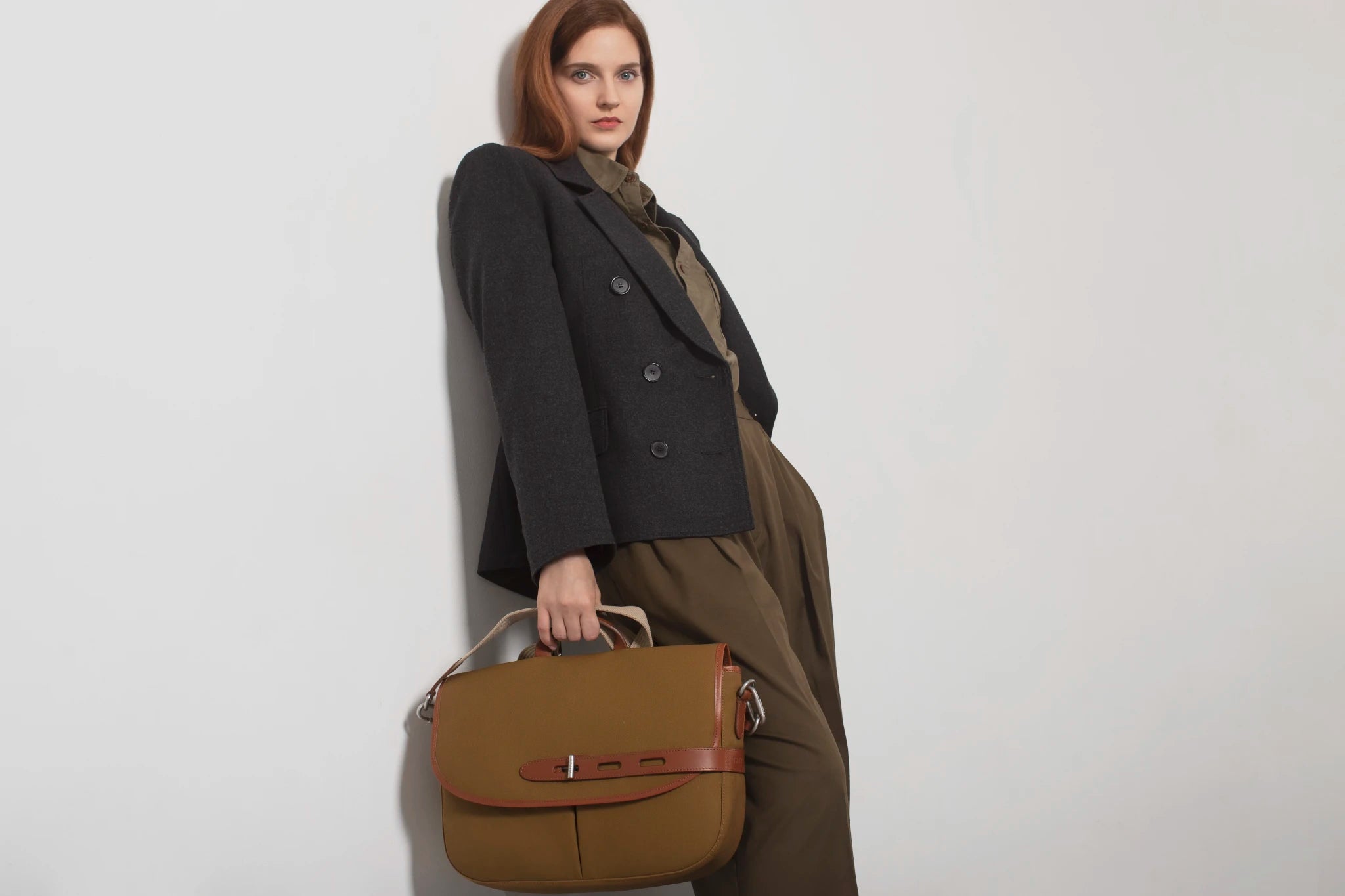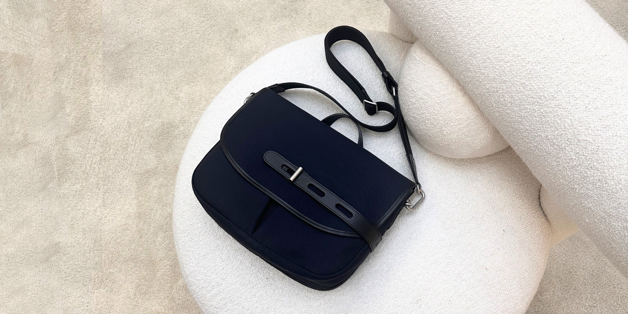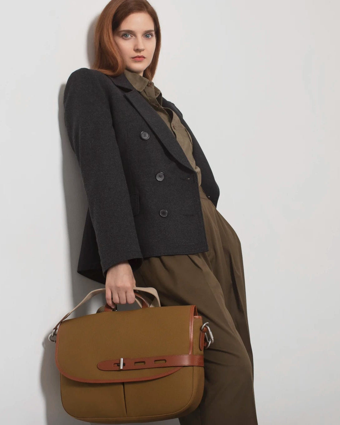 The quest for quality can be seen in the details: an engraved clasp, a fabric lined with vegetable-tanned leather, a handle for carrying by hand, the logo embossed on a leather patch, matte metalwork.