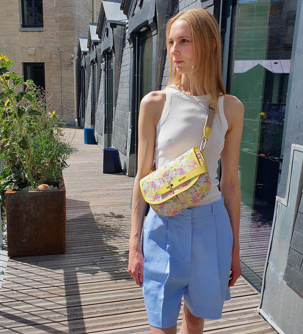 Size M model in yellow color. Water-repellent floral printed twill fabric and vegetable-tanned leather. Bag made in France from eco-responsible materials