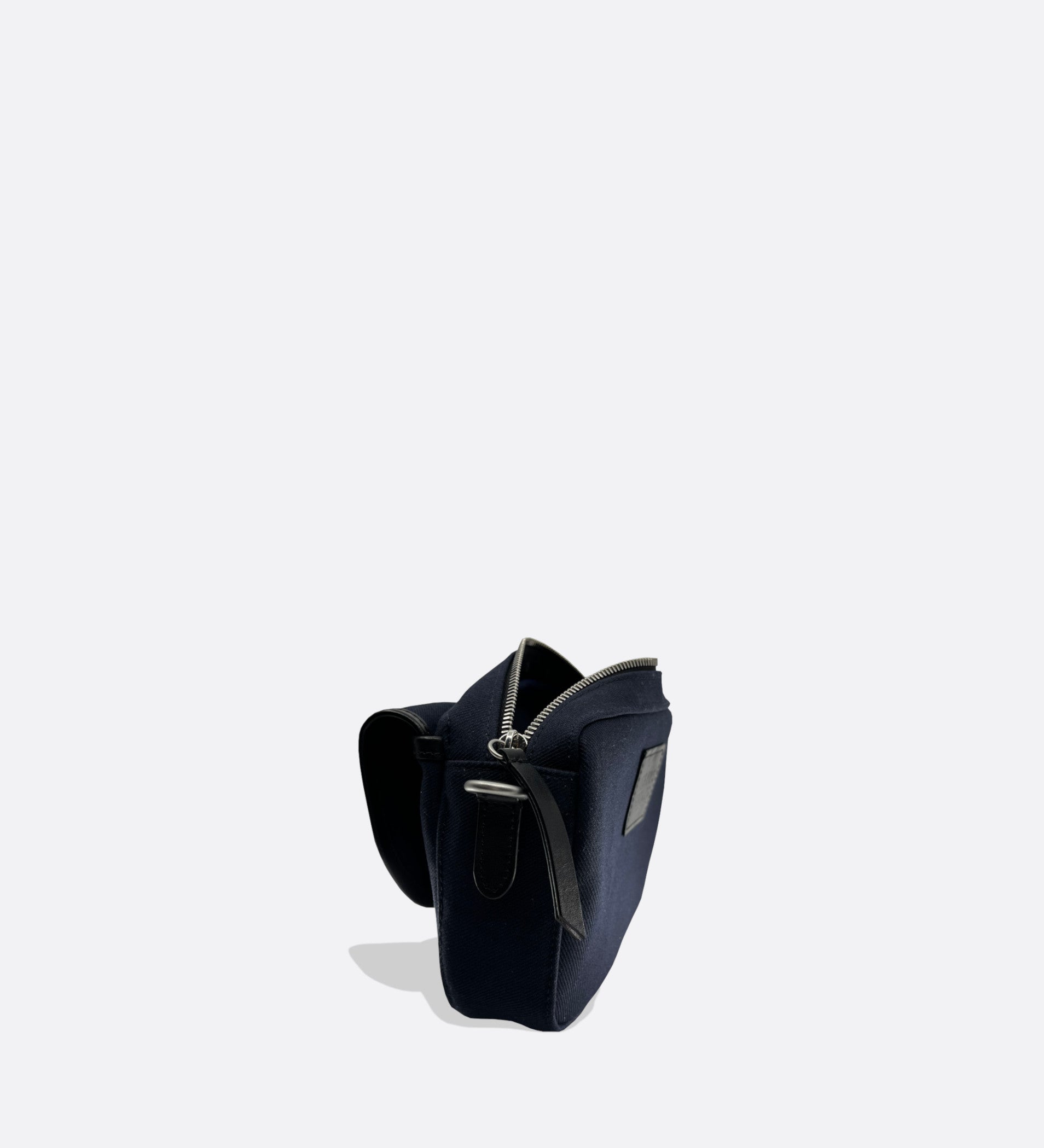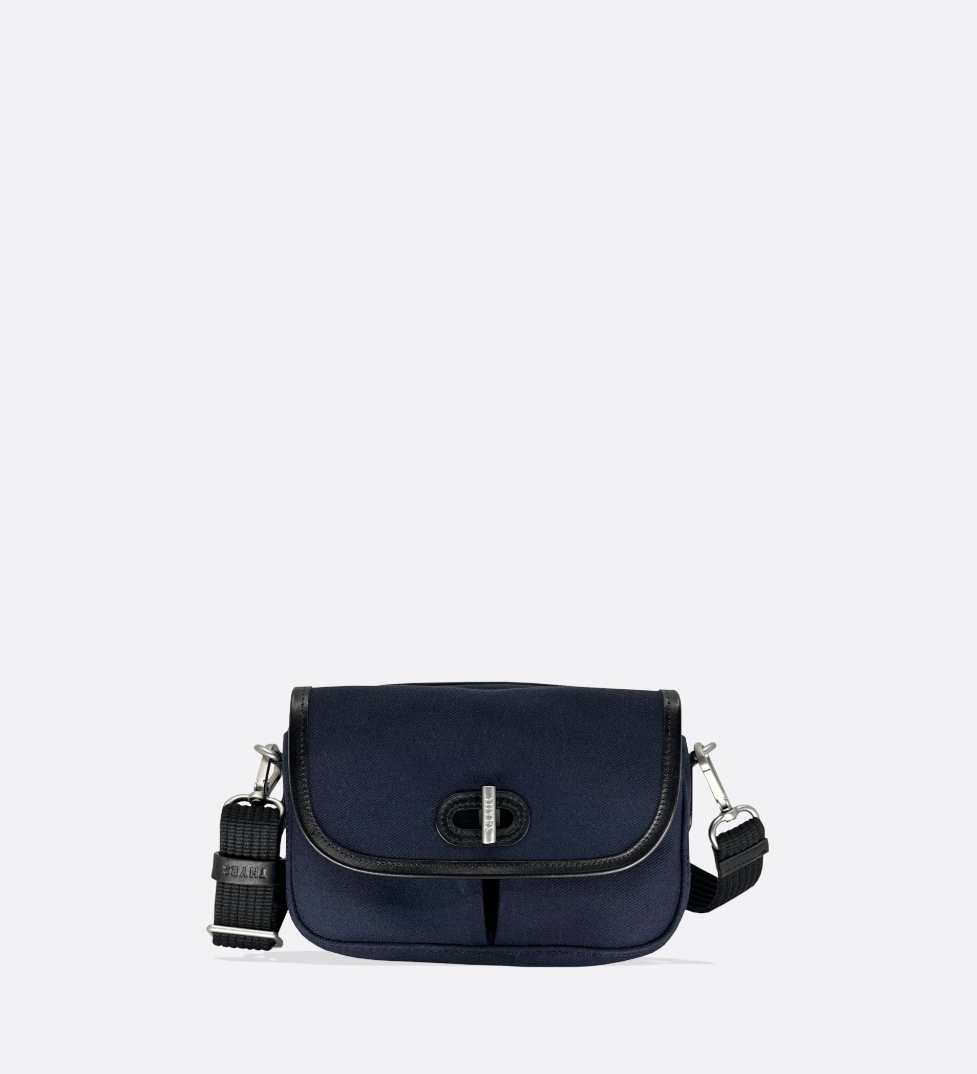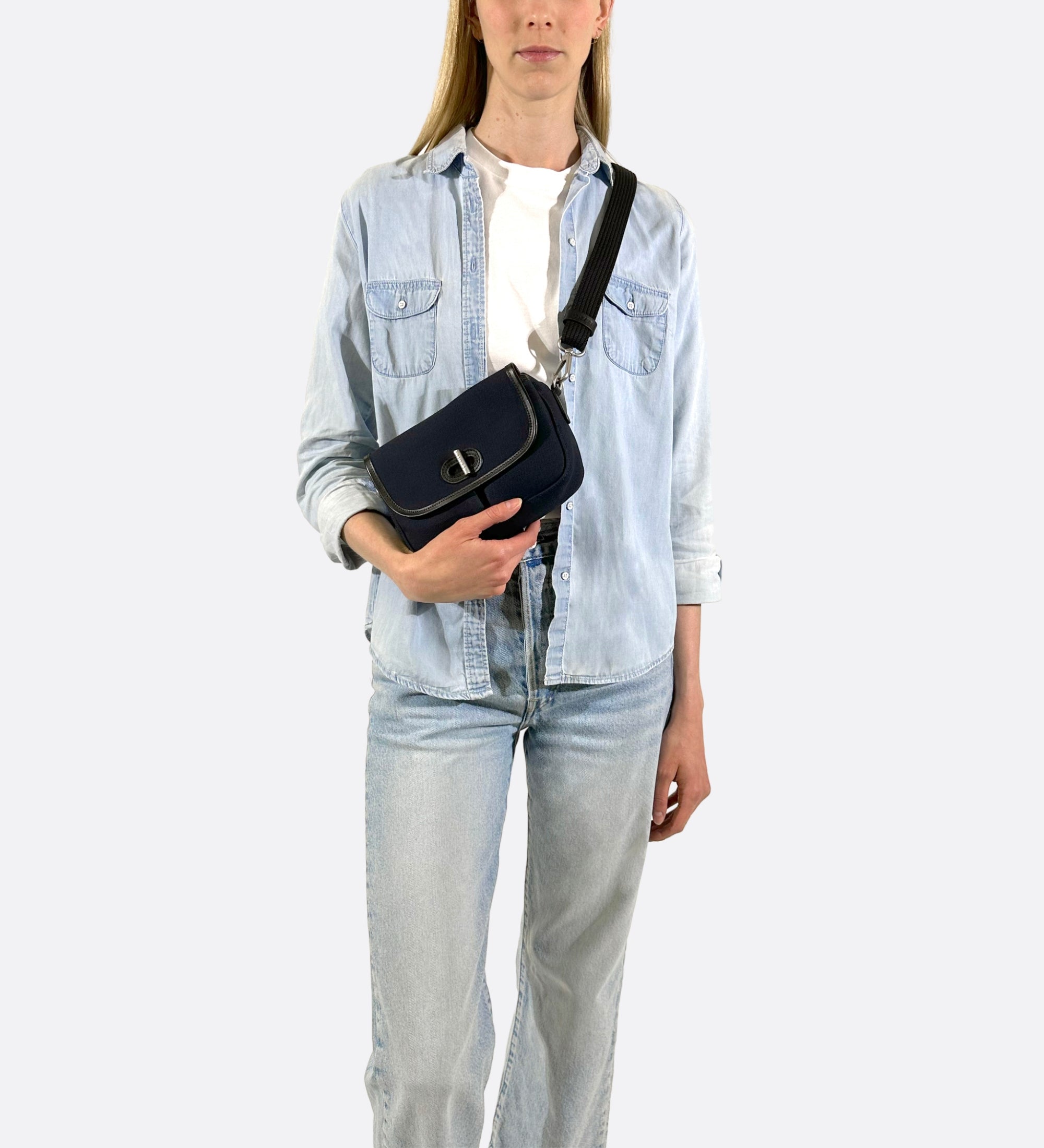 Size XS model in night navy color. Exclusive waterproof Double Twill fabric and vegetable-tanned leather. Bag made in France from eco-responsible materials.