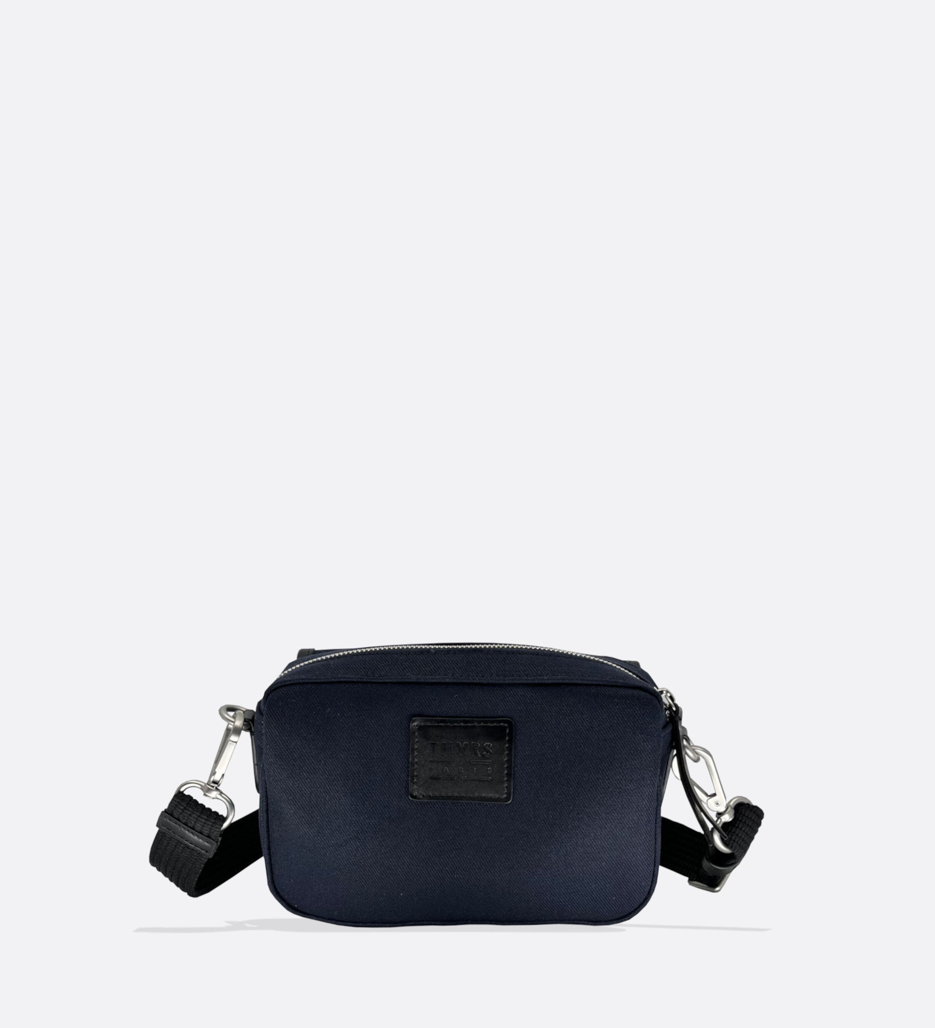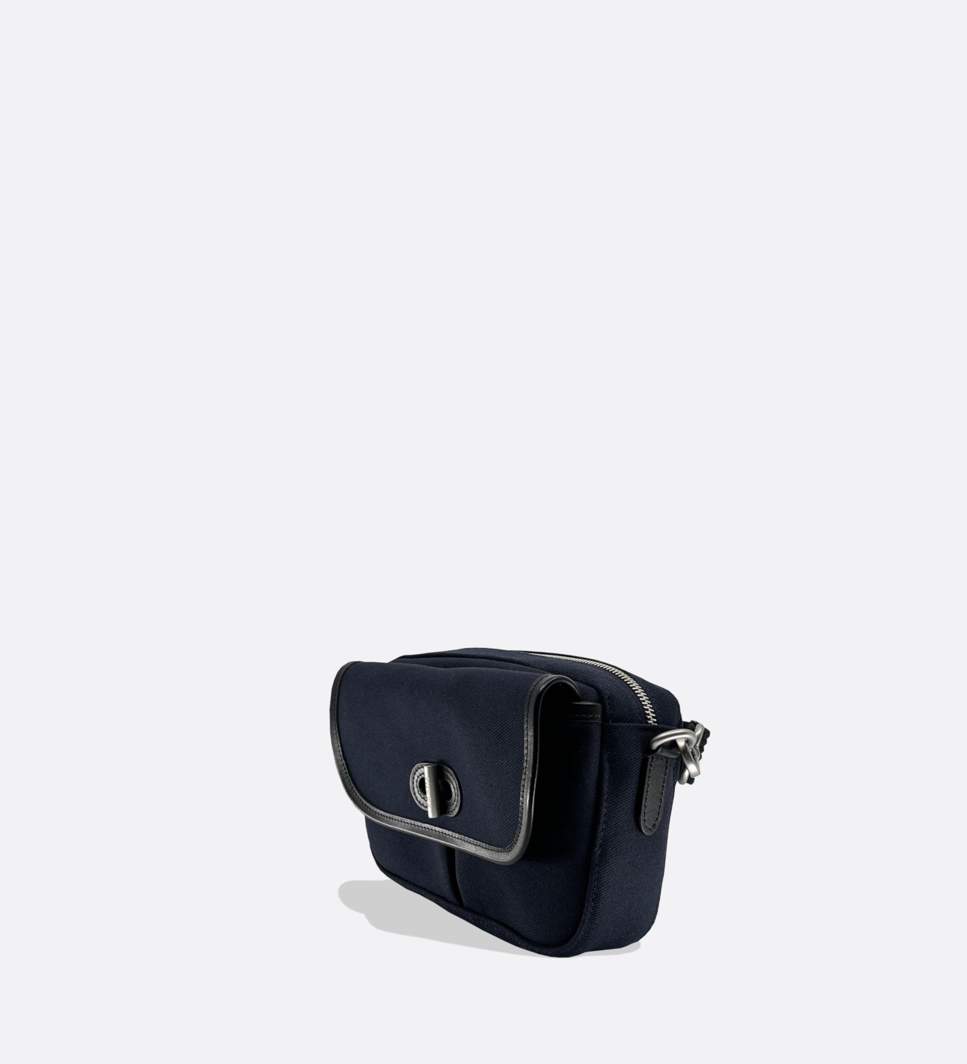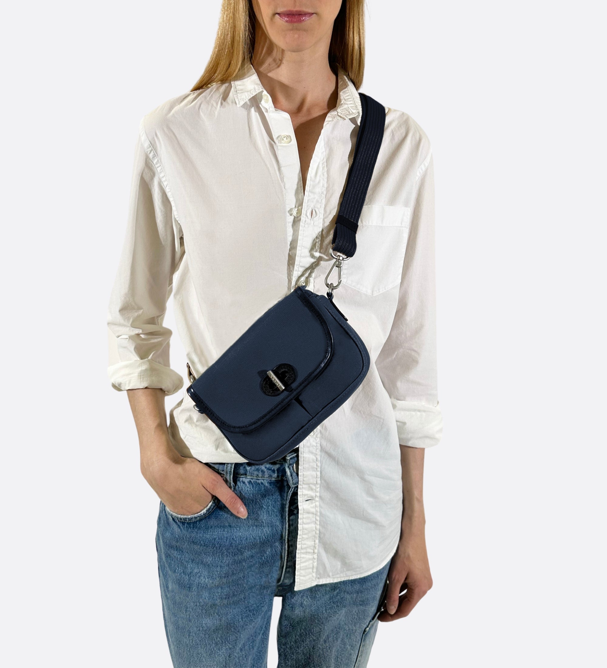 Size XS model in night navy color. Exclusive waterproof Double Twill fabric and vegetable-tanned leather. Bag made in France from eco-responsible materials.
