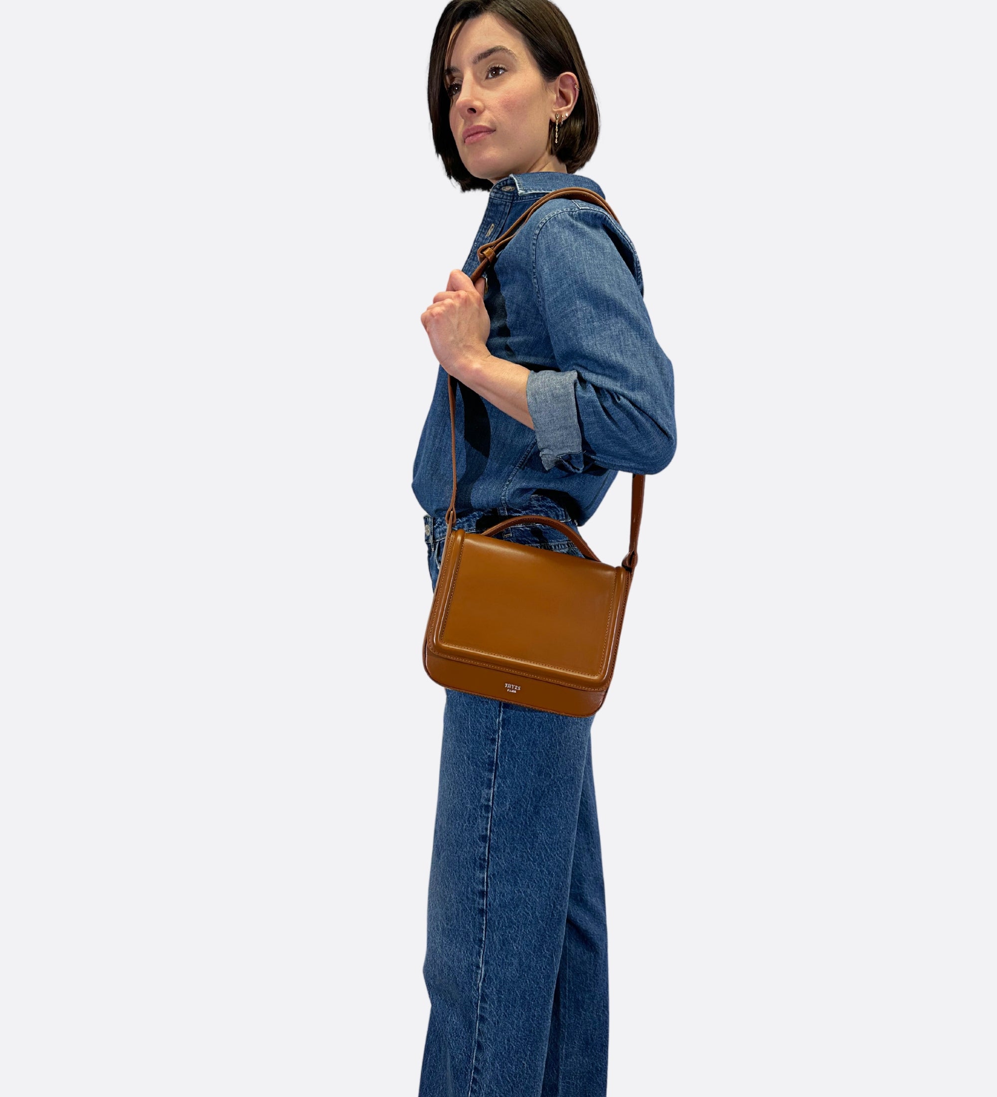 Model in smooth caramel-colored leather. Bag made in Portugal from LWG certified eco-responsible leather.