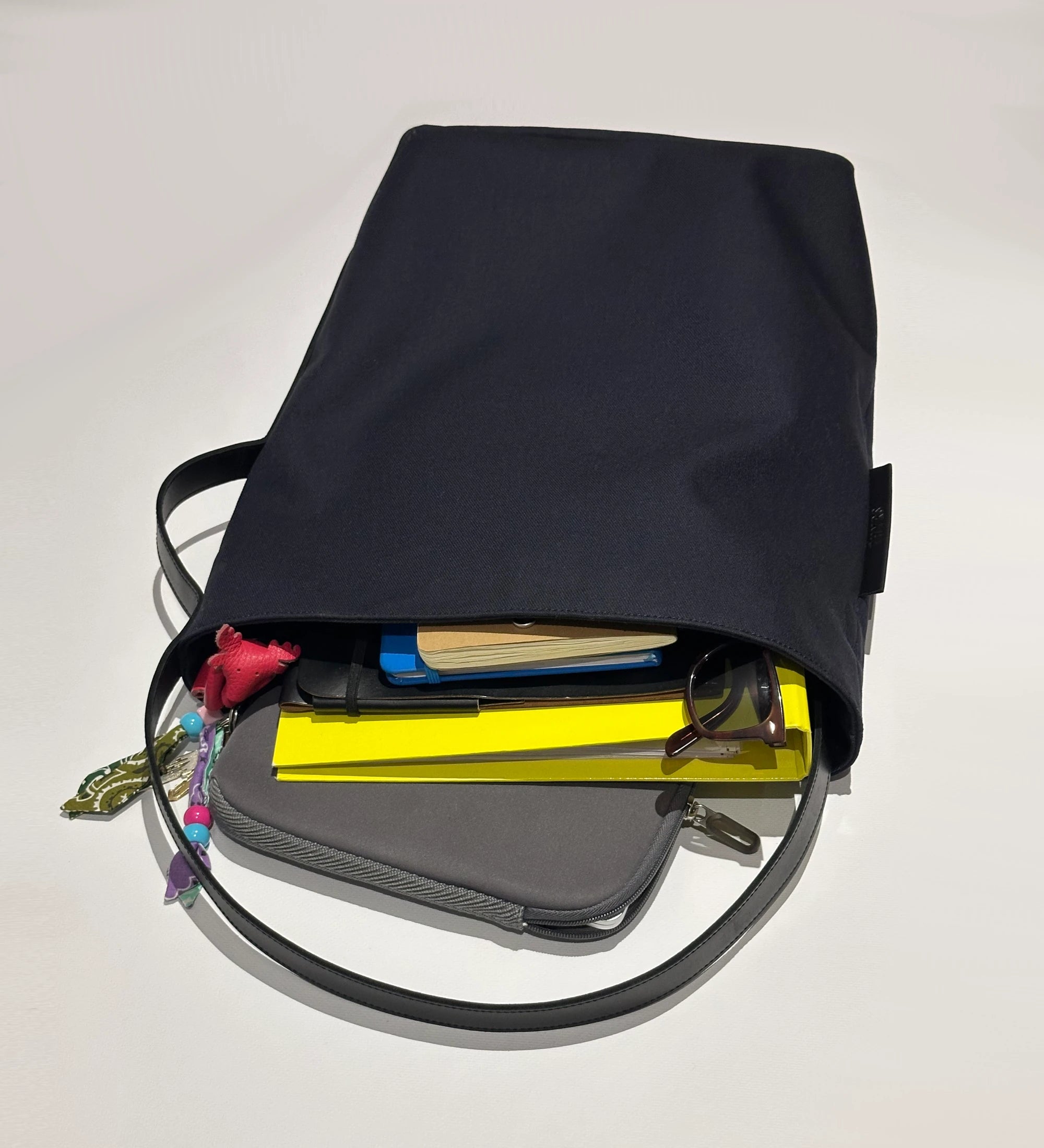 Vertical tote bag in night navy. Exclusive water-repellent Double Twill fabric and vegetable-tanned leather, LWG Gold certified.